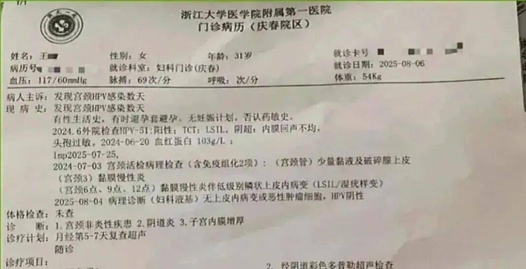 自该日至8月8日,两人在广州、杭州等地开房同居达十余天,期间王某曾因妇科问题前往医院就诊。一份来自某三甲医院妇科门诊的病历显示,王某就诊日期为8月6日,其主诉、现病史及诊断内容均涉及妇科相关问题。