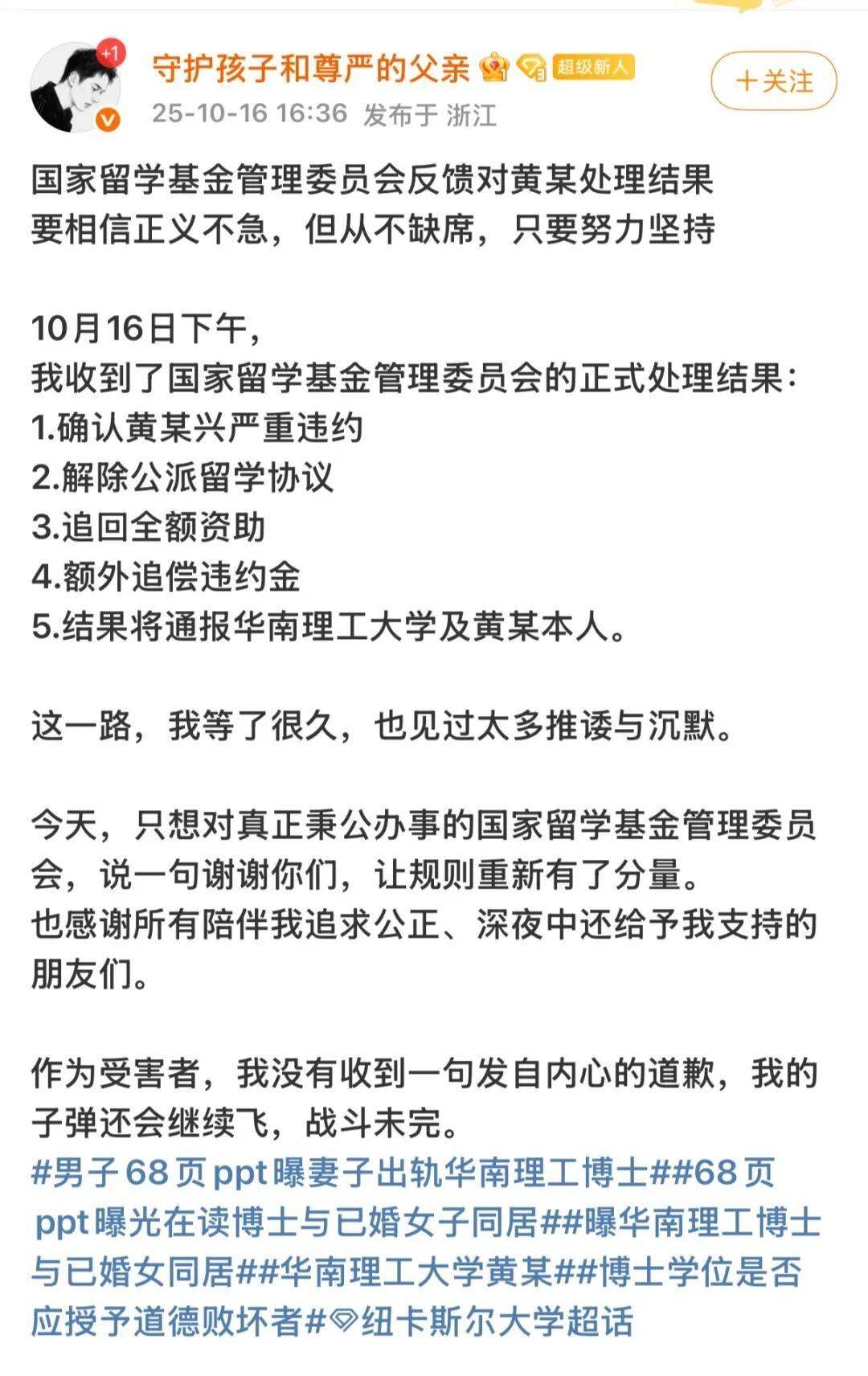 9月底,一名自称“守护孩子和尊严的父亲”的网友在网络上发布了一份长达68页的PPT,举报华南理工大学在读博士生黄某兴与其妻子存在长期不正当关系,此事迅速引发关注。
