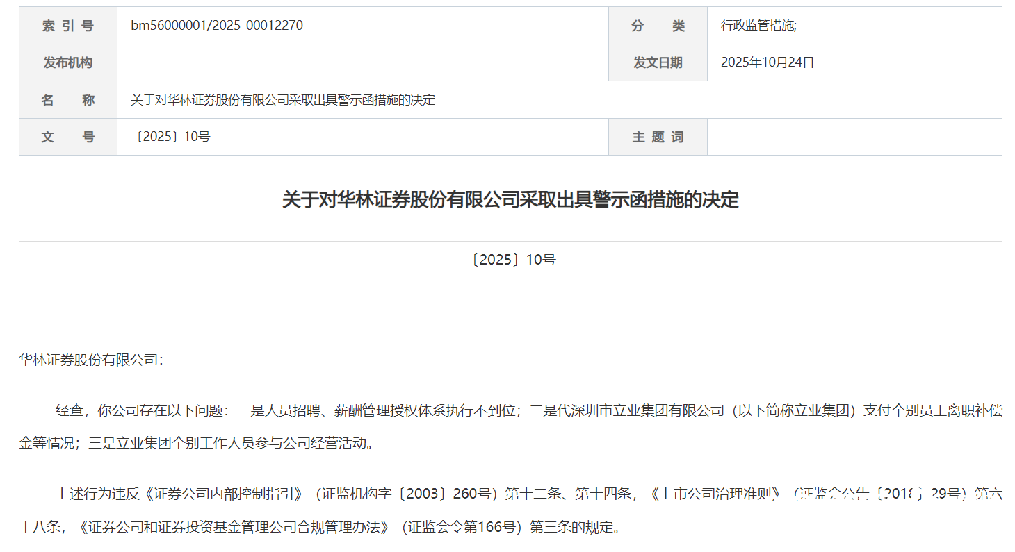 据悉,上海证监局认定华林证券上海分公司未严格规范员工执业行为,存在个别员工委托证券经纪人以外的第三方进行客户招揽活动的情形。因此,上海证监局决定对华林证券上海分公司采取出具警示函的行政监管措施。
