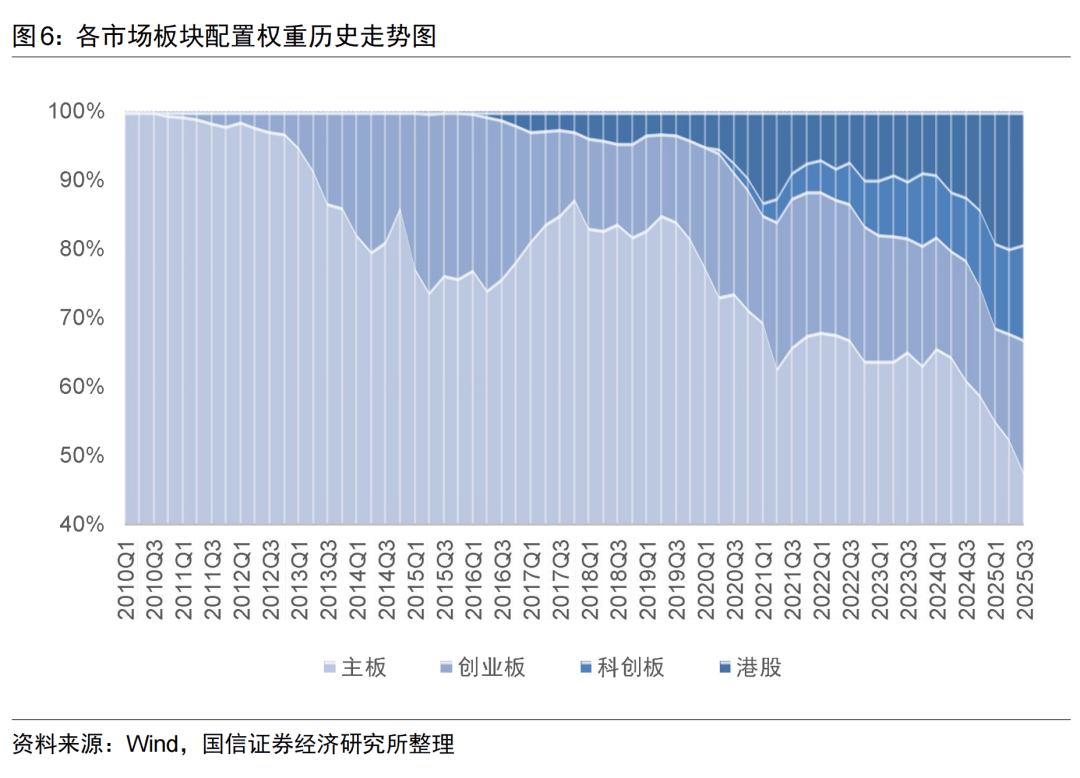 从市场板块配置的整体趋势来看,尽管主板与中小企业板进行了合并,主板配置权重仍处于历史低位。主板权重较上一季度明显降低,创业板和科创板权重明显提升,港股权重与上季度相比略有降低。其中,2025年三季报中披露的主板配置权重为47.54%、创业板配置权重为19.29%、科创板配置权重为13.91%,港股配置权重为19.26%。
