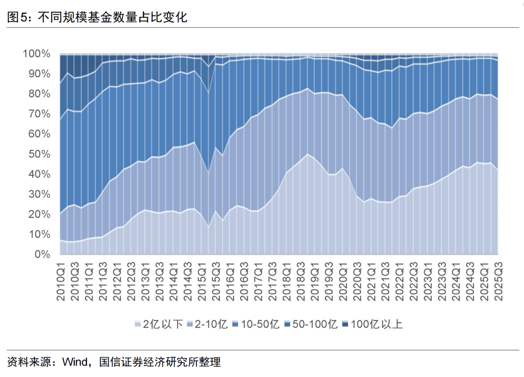截至2025年三季度,2亿以下基金占比为42.4%、2-10亿规模基金占比为35.18%、10-50亿规模基金占比为19.66%、50-100亿规模基金占比为2.04%、100亿以上规模基金占比为0.72%。