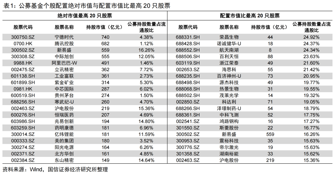 这里展示了本报告期主动权益基金个股配置绝对市值以及配置市值占流通市值比(简称配置市值比)这两个维度最高的前20只股票。对于参与计算的股票剔除上市不足9个月的新股。其中,个股配置绝对市值为主动权益基金配置个股市值的权重和。配置市值比为公募持股数量占该股票的流通股本的比例。