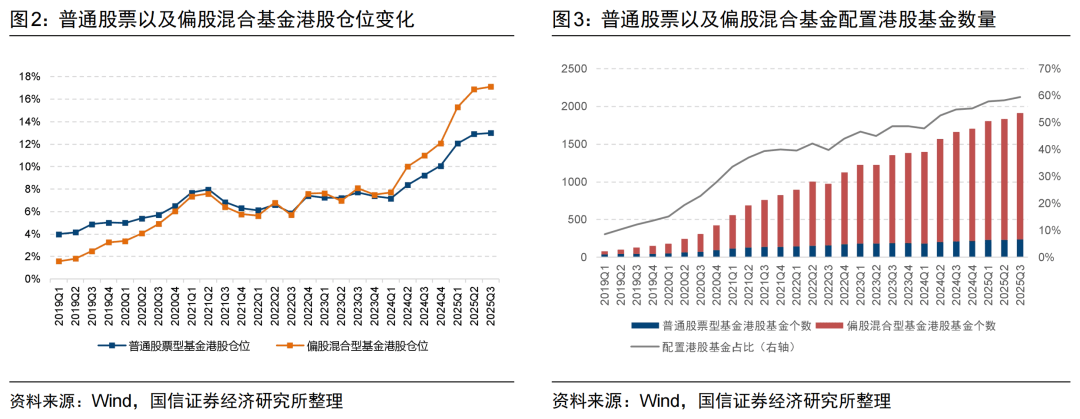 普通股票型基金和偏股混合型基金投资港股仓位均较上一季度小幅提升。基金港股仓位以及配置港股基金数量变化如下: