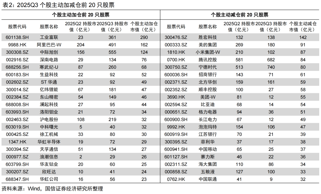 基金经理在个股上面主动加仓最多的三只股票分别为工业富联、阿里巴巴-W、中际旭创,而主动减仓最多的三只股票则为胜宏科技、美的集团、小米集团-W。