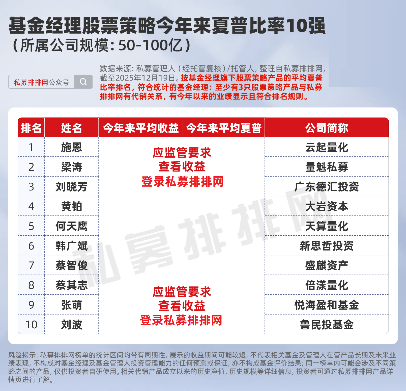 在准百亿私募(规模50-100亿)中,所管股票策略产品至少有3只符合排名规则的基金经理有29位,收益、夏普均值分别为35.57%、1.62。其中,今年来股票策略夏普比率10强基金经理的“上榜门槛”为***。