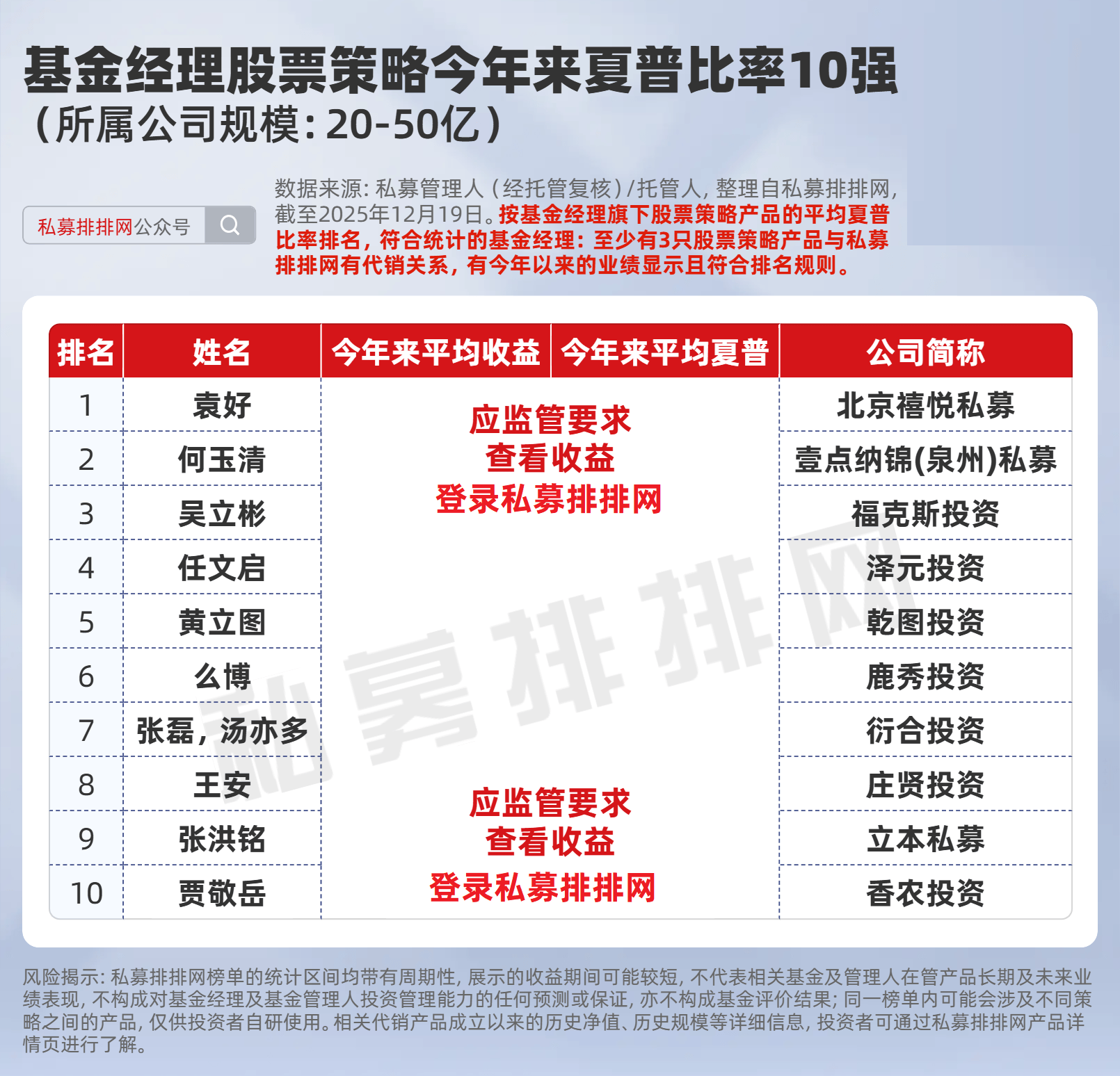 在规模为10-20亿的私募中,所管股票策略产品至少有3只符合排名规则的基金经理有36位,收益、夏普均值分别为41.89%、1.62。其中,今年来股票策略夏普比率10强基金经理的“上榜门槛”为***。