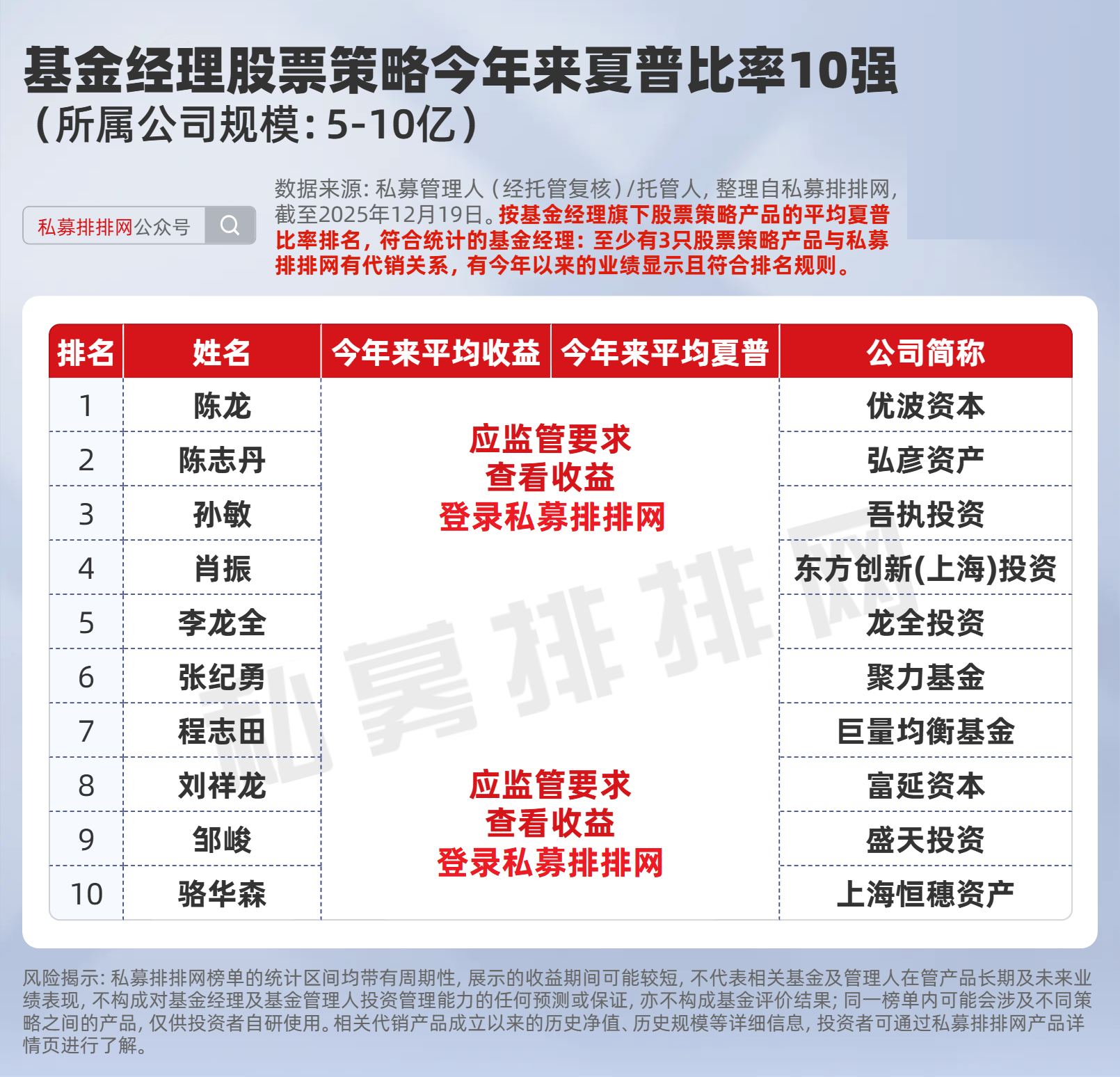 在规模为5-10亿的私募中,所管股票策略产品至少有3只符合排名规则的基金经理有52位,收益、夏普均值分别为34.57%、1.24。其中,今年来股票策略夏普比率10强基金经理的“上榜门槛”为***。
