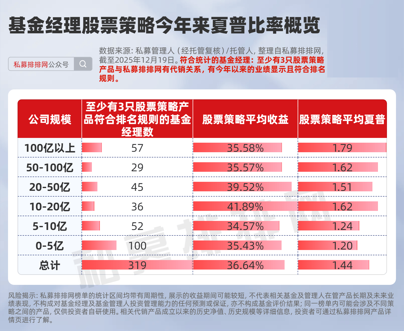 在规模为0-5亿的私募中,所管股票策略产品至少有3只符合排名规则的基金经理有100位,收益、夏普均值分别为35.43%、1.2。其中,今年来股票策略夏普比率10强基金经理的“上榜门槛”为***。