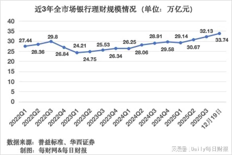因此,在以上多重因素的驱动下,2025年我国银行理财规模持续扩容,据华西证券测算数据显示,截至2025年12月19日,银行理财规模约33.74万亿。