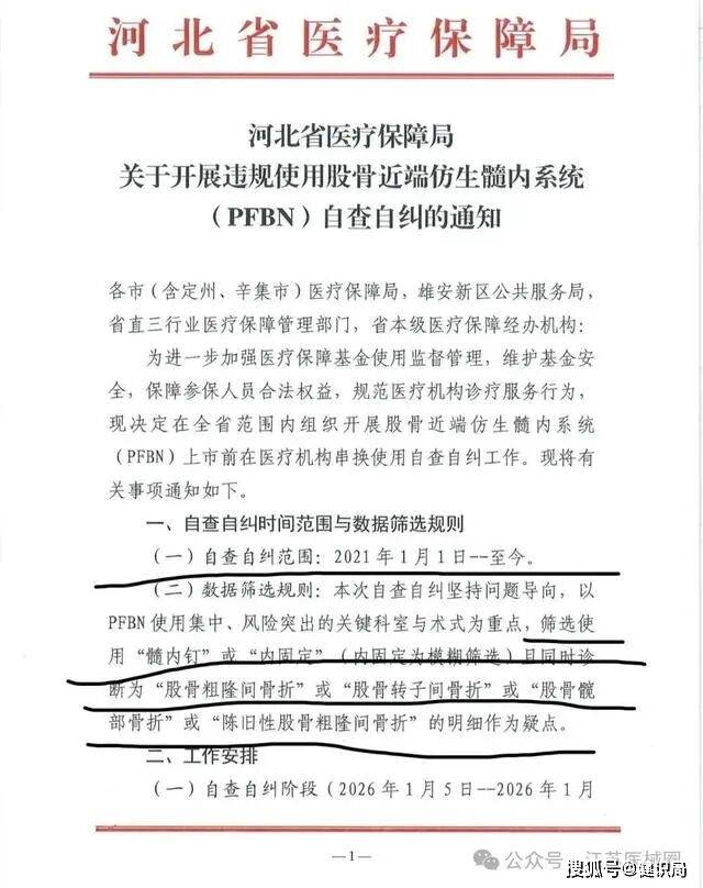 2026-01-14米兰体育,米兰体育官方网站,米兰体育APP下载近日,网传河北省医保局发布了一份《关于开展违规使用股骨近端仿生髓内系统(PFBN)违规使用自查自纠的通知》。通知要求1月5日起至1月19日,在河北全省范围内开展“股骨近端仿生髓内系统(PFBN)”上市前在医疗机构串换使用自查自纠工作。