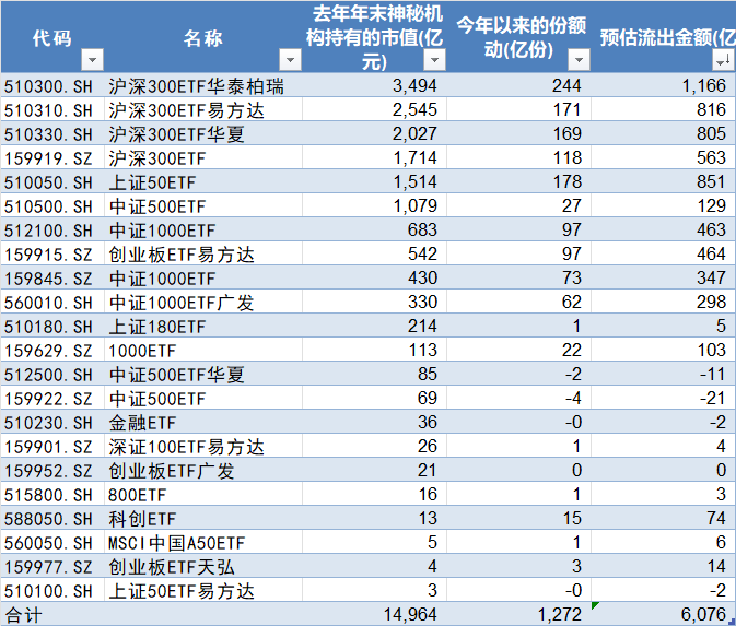 然后让我们来看一个这些头部的宽基ETF的流出情况,这个估算比较粗略,直接用今年以来的变动份额乘上区间的平均收盘价,预估今年以来累计流出6076亿元。
