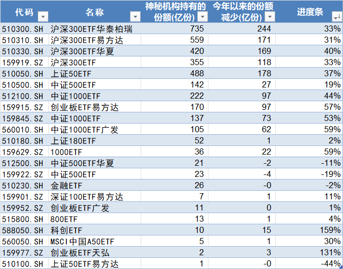 如果按照神秘机构持有的份额,结合今年以来的份额变动情况,将两者直接相除,可以大致的衡量进度条。用相除计算稍微有一些问题,但只能这样除了。因为这里面部分ETF的份额还是增加的、部分ETF该机构持有的分母过小,所以出现了一些是负数的值和一些高于100%的值,除法计算不一定精确。