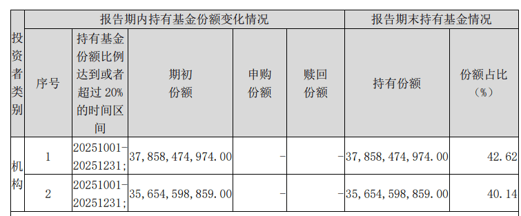 而在四季报中,这个抬头会被隐去,会变成神秘的“机构一”和“机构二”。从刚公布的基金四季报来看,这神秘的机构一和机构二,在三季度和四季度是一股都没卖的。也就是截至2025年12月31日,神秘机构持有的ETF份额并未发生变化,可以完全参照半年口径来统计的。