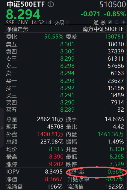 套利资金在里面承担了一个“中转商”的职责。这是我1月15日下午截图的中证500ETF实时折价率,折价率高达0.66%,这就是套利一次就能转到的钱。