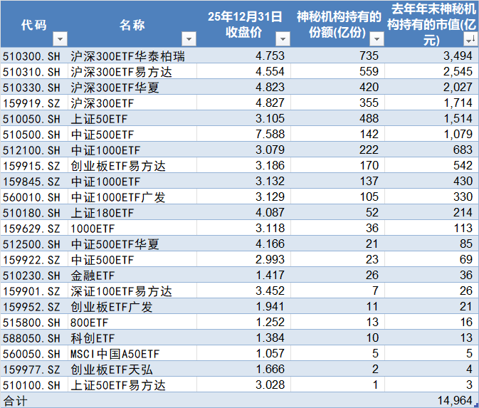为了力求统计的准确性,我以25年12月31日收盘价计算了神秘机构持有的ETF情况,毕竟按照那个口径是完全正确的。持有的明细数据如下图所示,共计持有14964亿元的ETF市值。网上传的神秘机构持有1.5万亿ETF这个数据,经过我的确认是对的。