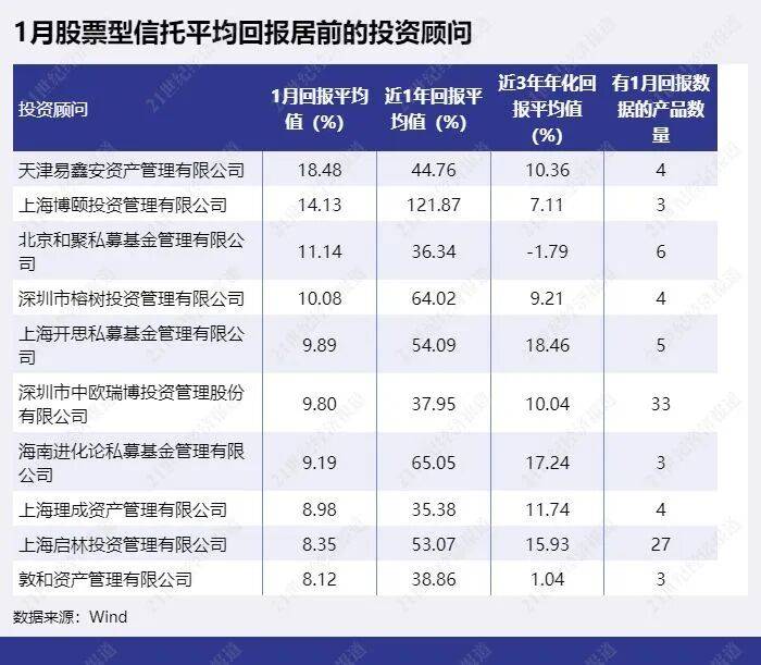 不少股票型信托由私募基金担任投资顾问,若以投资顾问统计,则1月以天津易鑫安资产管理担任投资顾问的股票型信托平均回报最高,达18.48%。上海博颐投资管理有限公司担任投资顾问的股票型信托平均回报排第二,1月回报平均值为14.13%,北京和聚私募基金管理有限公司以11.14%的平均回报排第三。
