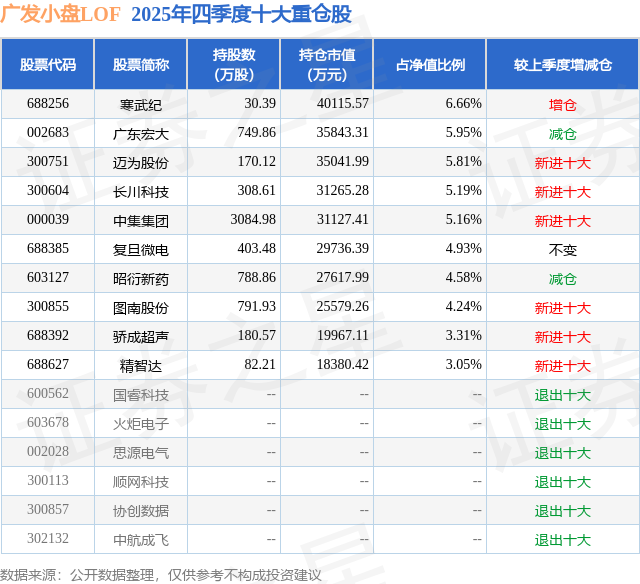 根据2025基金年报公募基金重仓股数据,重仓该股的公募基金共22家,其中持有数量最多的公募基金为广发基金的广发小盘LOF。广发小盘LOF目前规模为57.68亿元,最新净值2.16(3月10日),较上一交易日上涨2.59%,近一年上涨56.74%。该公募基金现任基金经理为吴远怡 陈韫中。吴远怡在任的基金产品包括:广发创新升级混合,管理时间为2020年9月30日至今,期间收益率为-5.59%;广发科技创新混合A,管理时间为2020年11月18日至今,期间收益率为90.28%;广发价值核心混合A,管理时间为2022年11月1日至今,期间收益率为115.04%;广发成长领航一年持有混合A,管理时间为2023年3月10日至今,期间收益率为153.03%。陈韫中在任的基金产品包括:广发中小盘精选混合A,管理时间为2021年9月28日至今,期间收益率为72.21%;广发成长启航混合A,管理时间为2024年3月19日至今,期间收益率为191.1%;广发科技动力股票,管理时间为2024年5月31日至今,期间收益率为74.6%;