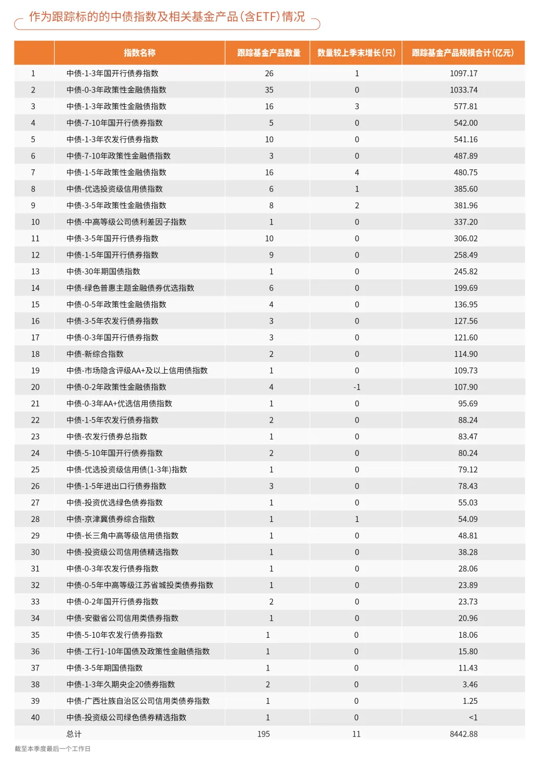 截至2025年四季度末,境内外共有40只中债指数被用作投资跟踪标的,跟踪基金产品资产规模共计8442.88亿元人民币。