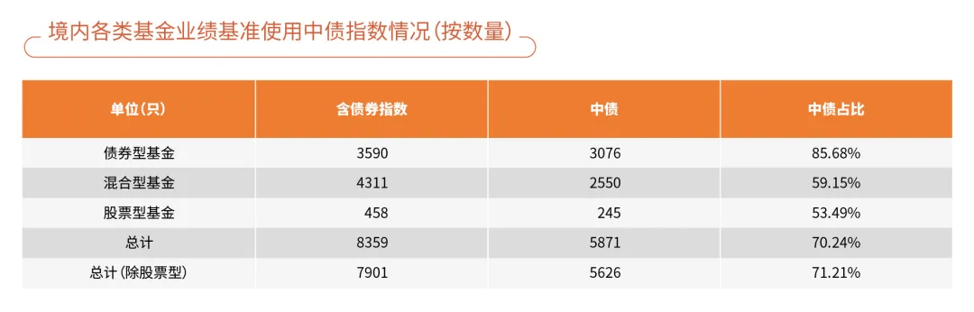 中债指数在业绩基准领域的市场份额持续领先。截至2025年四季度末,以债券指数为业绩比较基准的债券型基金共3590只,规模约为9.88万亿元,其中3076只使用中债指数,规模约为7.45万亿元,数量及规模上中债指数的市场占比均约八成。