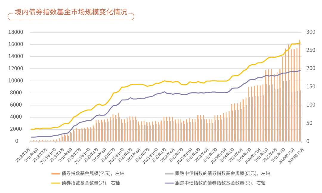 2026-03-19米兰体育,米兰体育官方网站,米兰体育APP下载相较于上季度,2025年四季度境内存续债券指数基金产品数量、规模都有所上升。截至2025年四季度末,境内市场存续债券指数基金产品共271只,规模为16777.95亿元。其中,采用中债指数作为跟踪标的的存续债券指数基金产品数量为194只,该部分基金产品规模为8427.08亿元。