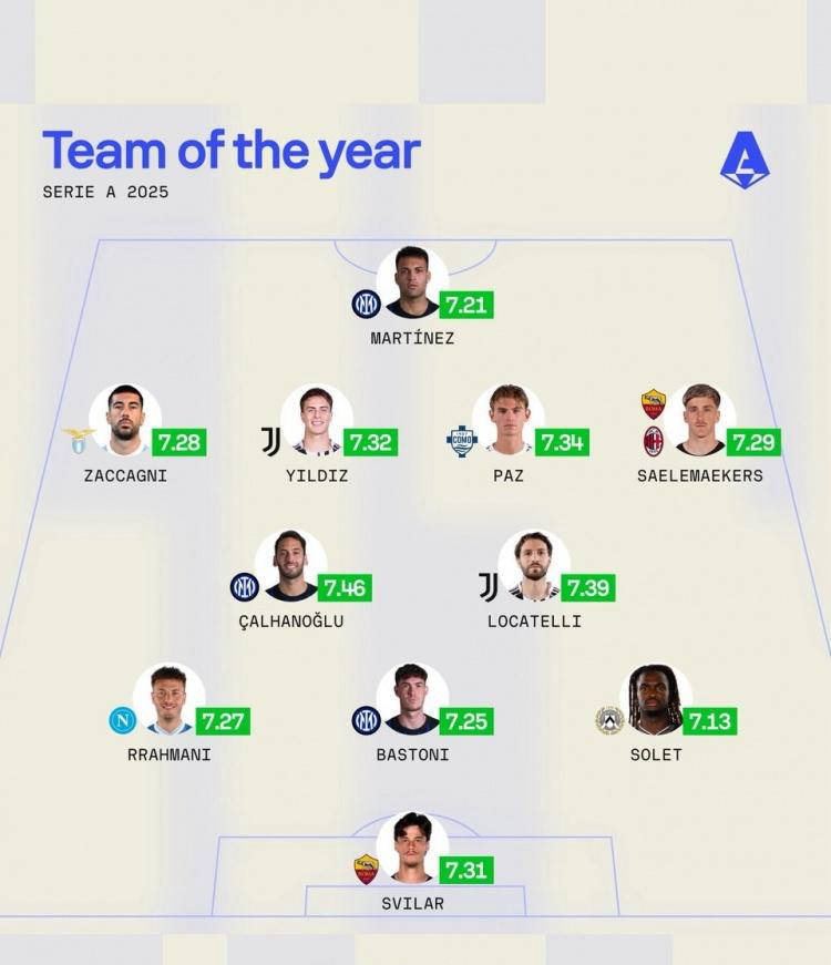 此外,sofascore平台统计出2025赛季意甲最佳首发阵容,国际米兰共计三名球员入选,彰显球队整体实力。最佳阵容中,中锋位置由劳塔罗担当;中场则包括扎卡尼、伊尔迪兹、帕斯与萨勒马科尔斯;防线由拉赫马尼、巴斯托尼及欧马·索勒组成,而门将位置则由斯维拉尔把守。
